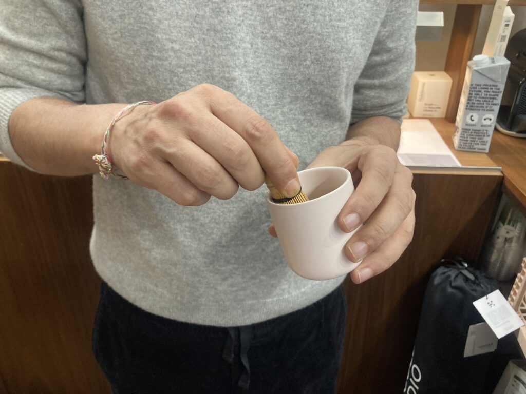 このマカロン2個、またはマカロン1個+抹茶ラテ1杯で、1日に必要なコラーゲン量を摂取できるとのこと。Holidermieのブティックでは、スタッフの方がその場で抹茶をたててくれました!