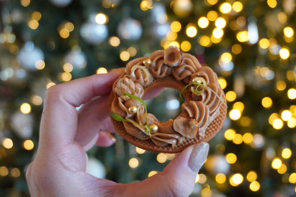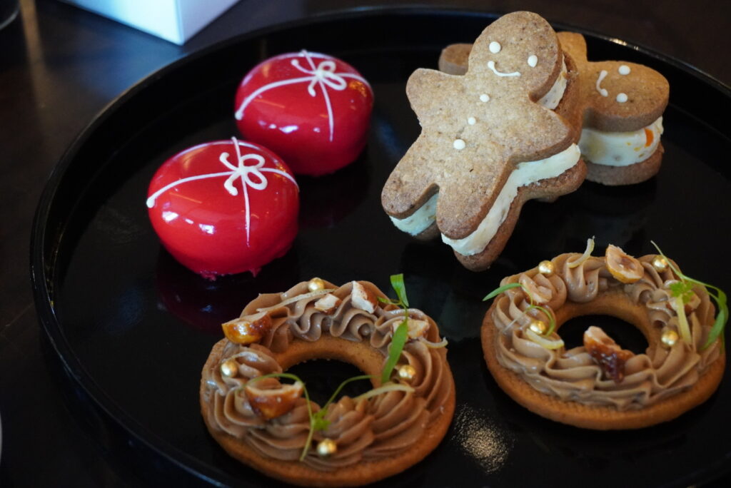 主役となる「ジンジャーブレッドサンド」(写真左)は、洋酒に漬け込んだドライフルーツをバタークリームに練り込んだ、シュトレンのような奥深い味わい。香ばしいスパイスの香りとともに、クリスマスらしい幸福感が広がります。「コフレベルベット」(写真右の左上)は、艶めく赤が印象的なオーナメント仕立て。