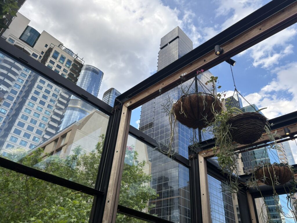 大きな観葉植物や木製デッキが配された空間は、都会の中のオアシスのよう。