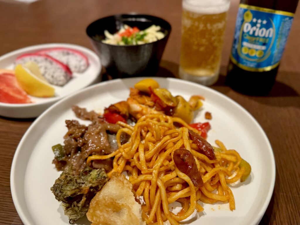 オリオンビールを片手に、定番の沖縄そばや、沖縄そばをアレンジしたナポリタン、さらに南国らしいフルーツまで。ローカル感とホテルらしい遊び心がほどよく混ざり合い、旅気分が一気に高まるラインナップでした。