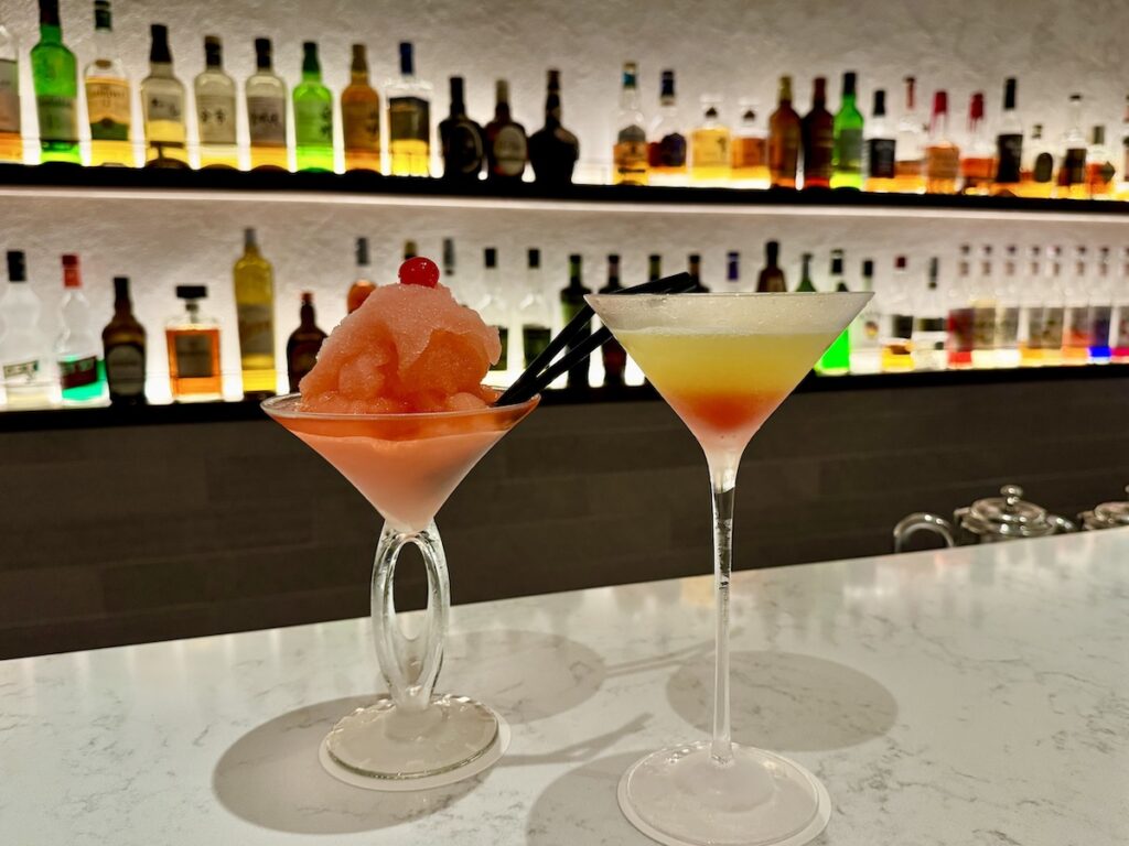 左側のグラスには、ホテル伝統カクテル「フローズンピーチ」。ウォッカにピーチやレモンジュースを合わせ、シャーベット状に仕上げられており、ゆっくりと溶けながら味わうことで、長い時間かけてそのフルーティーな香りと爽やかな味わいを楽しめる一杯でした。