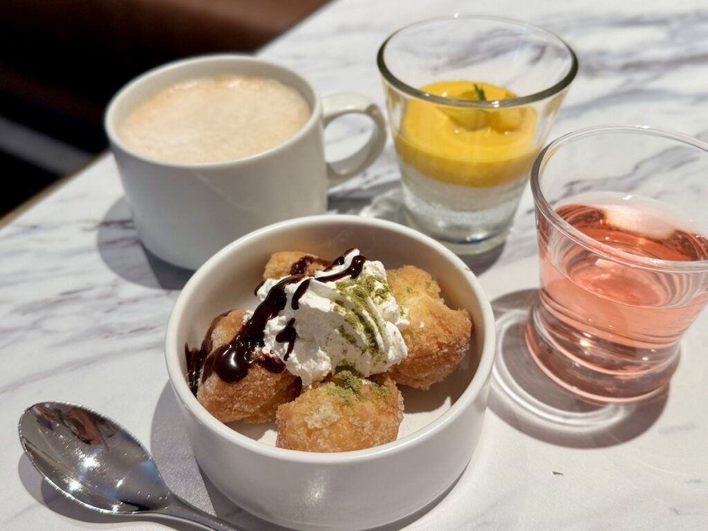 揚げたてのサーターアンダギーには、自分でトッピングを楽しめる工夫もあり、私は沖縄らしく月桃を生クリームとチョコで合わせてみました。ハーブのように爽やかな月桃の香りが加わることで、これまでに味わったことのない新鮮なサーターアンダギーに。食べるたびにワクワクする、旅ならではの朝食体験になりました。