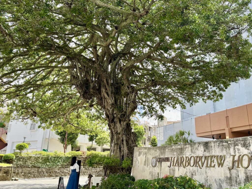 那覇の中心にありながら、ホテルのエントランスには大きなガジュマルが堂々と佇み、訪れる人を静かに迎えてくれます。こちらのガジュマルは樹齢200年だそうなので、開業から50年の歴史をずっと見守ってきた存在ですね。