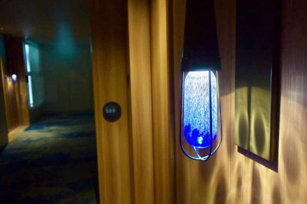 部屋前には、そっと灯る琉球ガラスの照明。透き通るようなガラスの輝きはとても涼やかで、通路にほんのりと清らかな空気をまとわせていました。