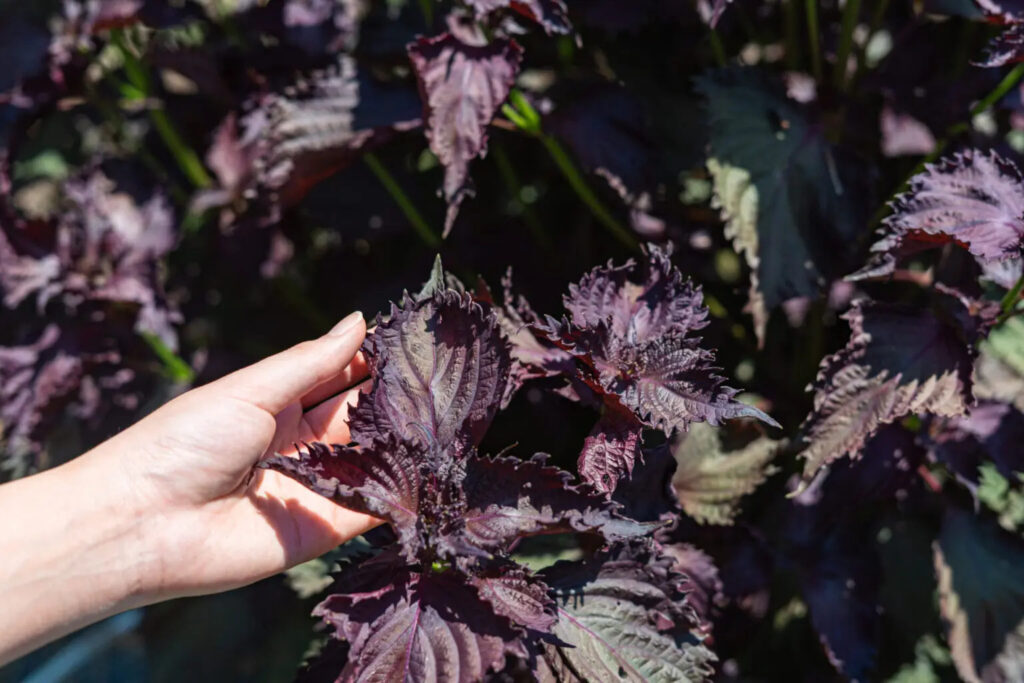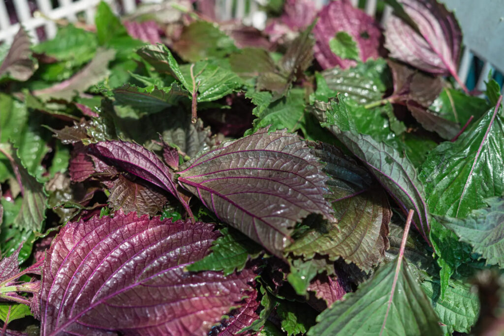 「赤しそってけっこう大きくなるんですよ。普通の畑で見る分には、だいたい40〜50センチくらいでしょうか。でも、ここではしっかり育てるので、大人の腰より高くなります。子どもだったら隠れちゃってどこにいるか分からないくらいになりますね(笑)」