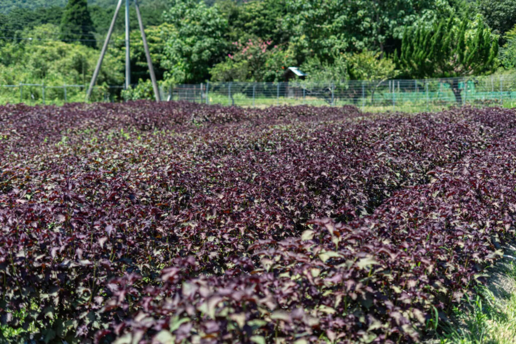 収穫の夏、赤しそ畑に伺うと、絨毯さながら、農地一面に赤紫色の鮮やかな光景が広がっていました。葉は大人の手のひらほどのサイズにまで育っています。