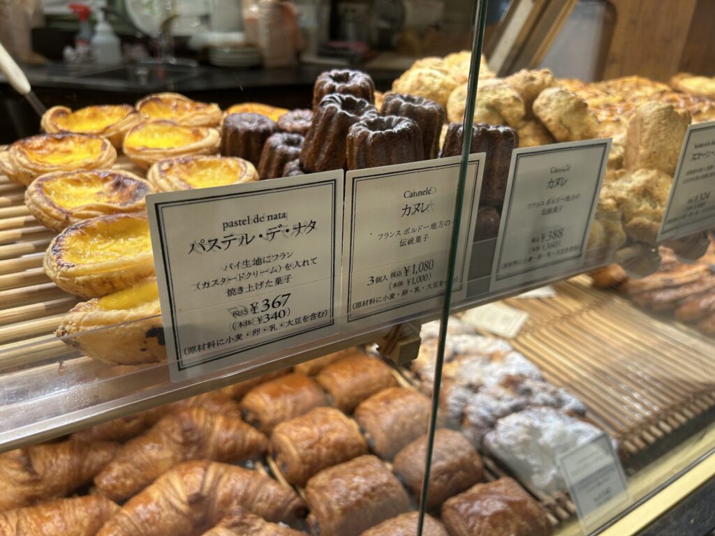 写真右奥には、フランスボルドー地方の伝統菓子であるカヌレ。PAULの人気商品の一つです。外はカリッ、中身はもっちりしたシンプルで素朴な味で飽きない逸品。1つ388円で店頭販売されているので、お土産にも良いですね。