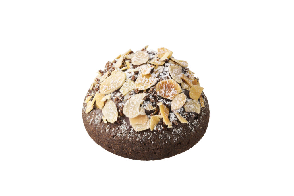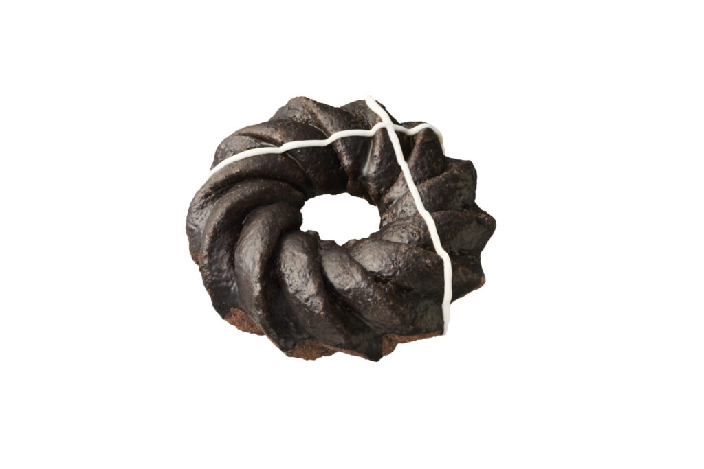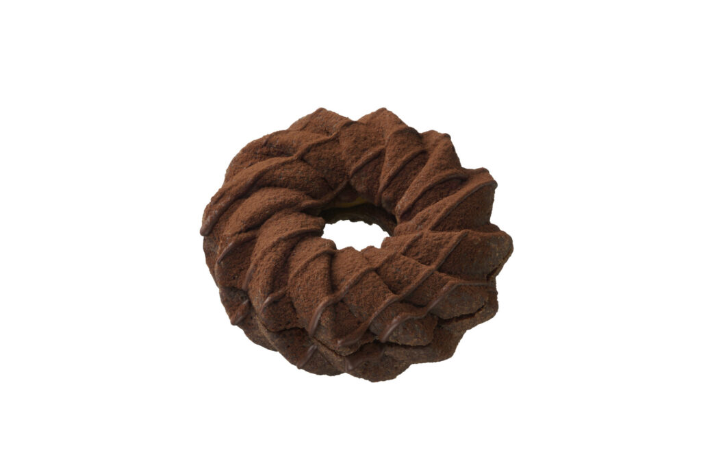 ゴディバのトリュフショコラから着想を得て開発したトリュフショコラドーナツ生地はなめらかで、見た目よりも軽やかな食感です。ノワールはガナッシュクリームとガナッシュホイップを、プラリネはガナッシュクリームとプラリネホイップを重ね、それぞれチョコレートをコーティング。仕上げにフレークチョコとココアパウダー、ローストアーモンドとチョコクランチをトッピング。濃厚なドーナツに仕上がっています。