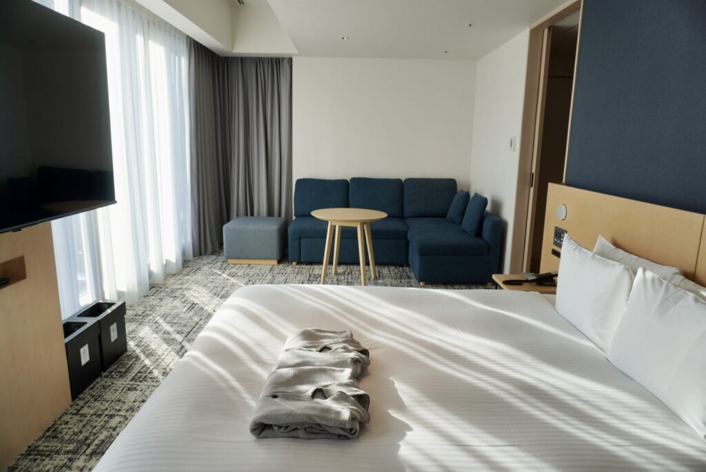 この日宿泊したのは、「デラックスコーナーツイン」。部屋の扉を開けると、光をやわらかく受け止めるインテリア。ベッドの白、壁のニュアンスカラー、整えられた動線。視界に入るものすべてが、思考をほどくように配置されています。
