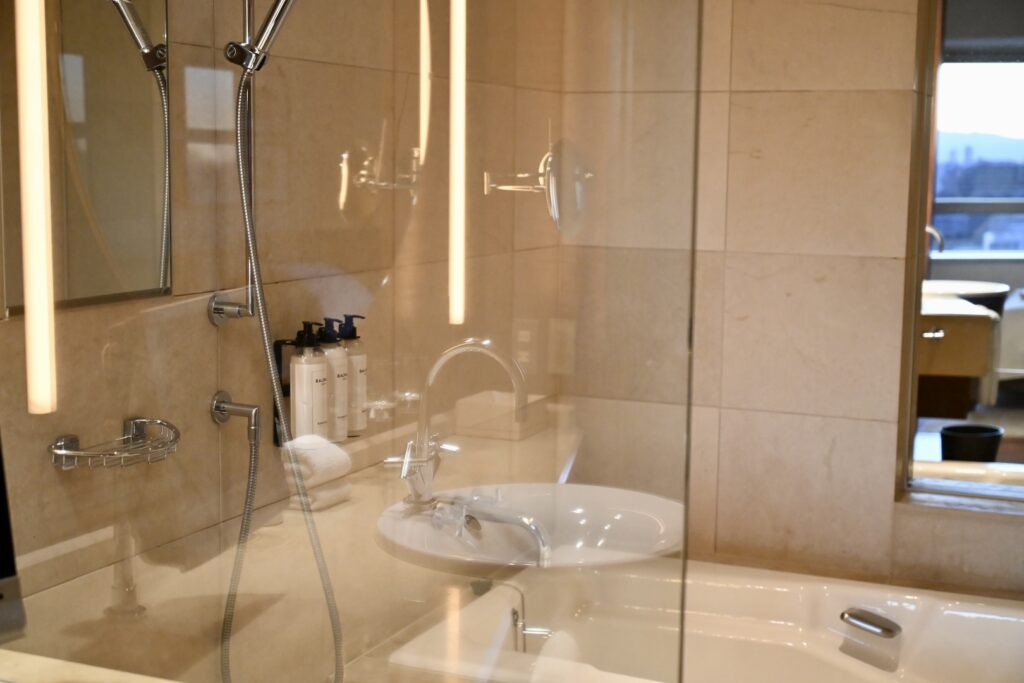 客室でまず心を奪われたのが、バスルームの美しさ。大理石調の洗練された空間に、清潔感とラグジュアリーが静かに共存する設えです。バスタブまわりもゆとりがあり、日常から切り離された“整う時間”を過ごせる場所に。