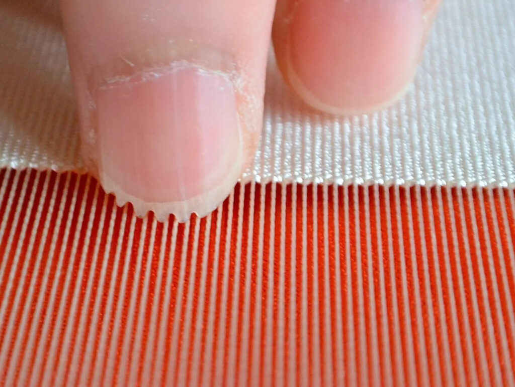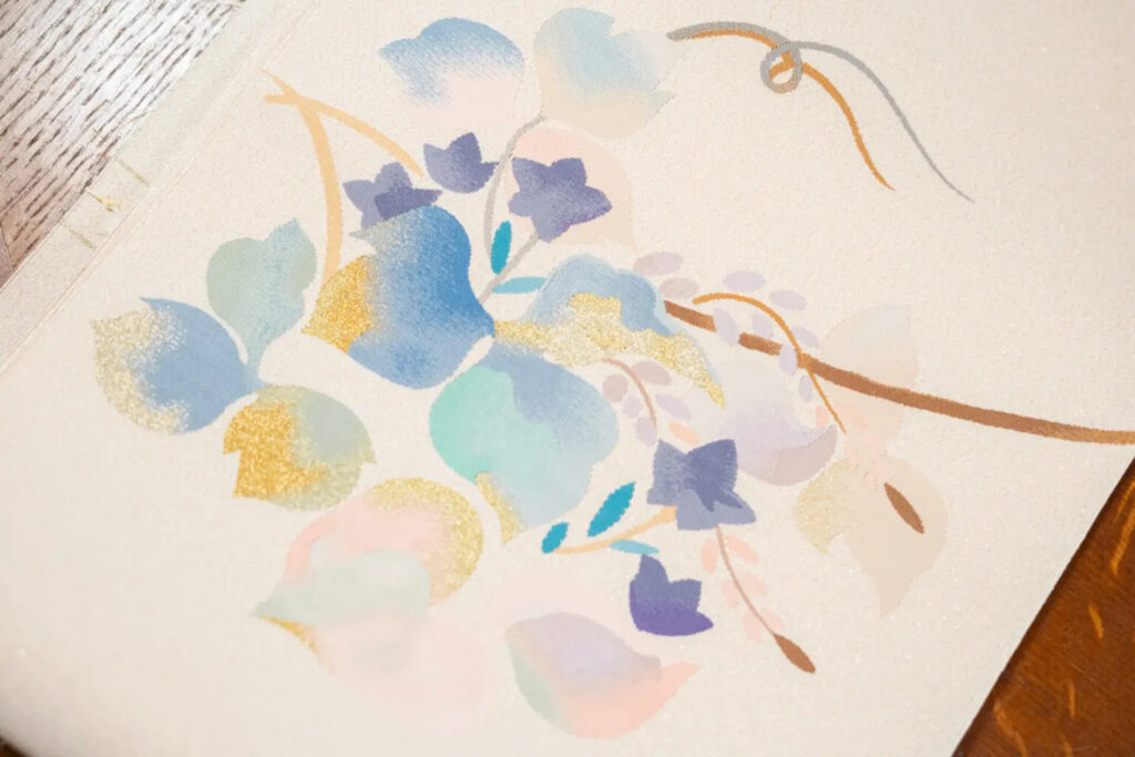 細い絹糸を10本束ねて1本の糸を作り、さらにその中に最大10色を混ぜることで、自然なグラデーションを表現できるのが特徴。色を「塗る」のではなく、「混ぜる」ことで描くというこの手法は、絵画にも似た深みと奥行きを生み出します。完成した布地の表面には、まるで畝のような立体感ある横線が現れ、他の織物とは一線を画す風合いを持ちます。