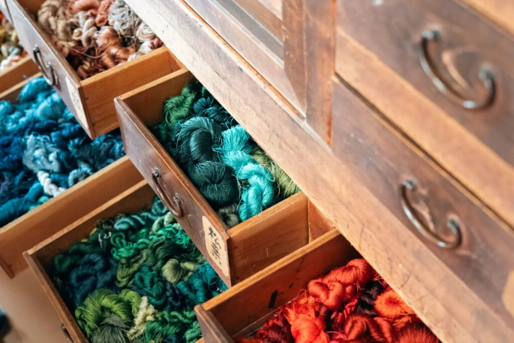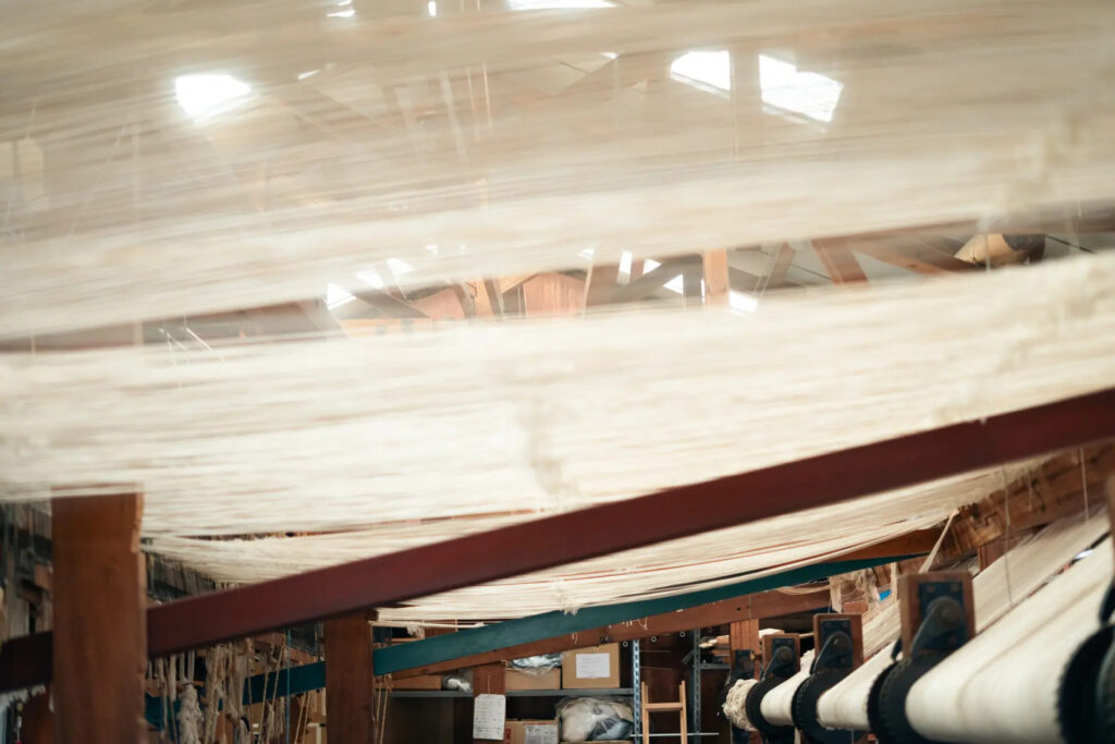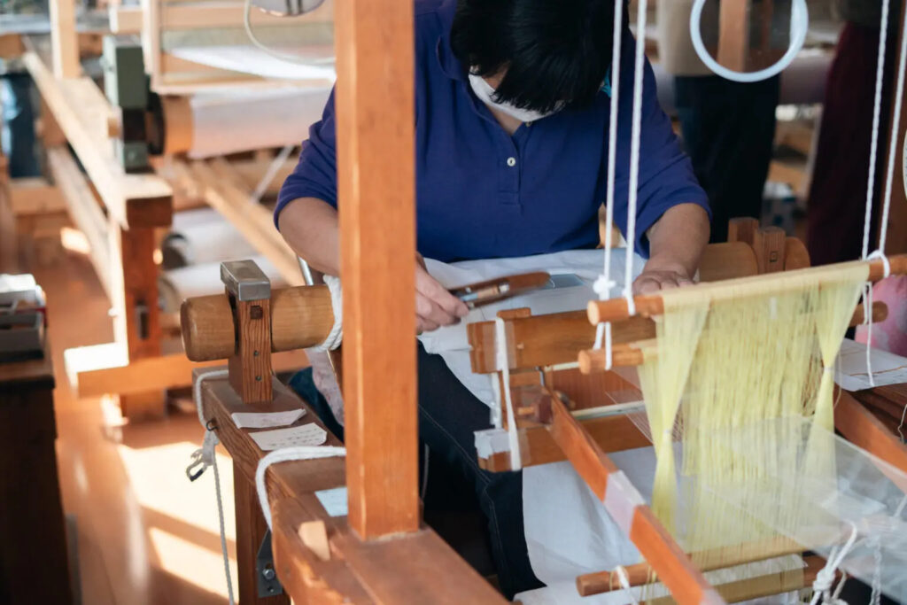 住宅街の中にふと現れる工房&ショップ。入り口の土間を抜けた奥には、静かに機を動かす職人たちの姿があります。糸の擦れる音が響く工房では、150年にわたり受け継がれてきた技術と精神が、今日も一枚の織物として形を成していきます。