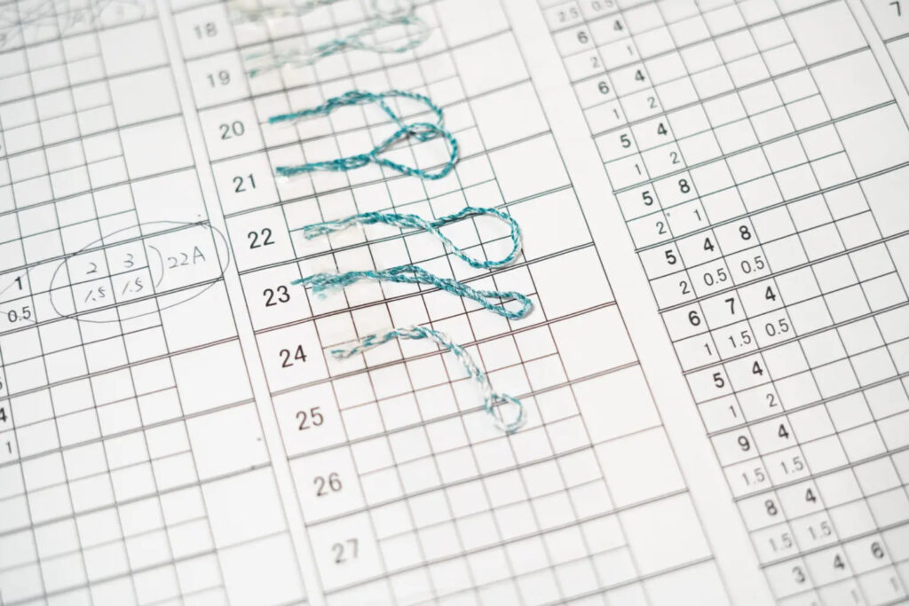 作業は大きく2工程に分かれます。まず、色の糸をどう組み合わせるかの設計図を作成すること。そして、その設計図に基づいて織り上げていくことです。織り機では布が奥側に織り込まれていくため、全体像を常にイメージしながら進める必要があります。設計図通りに織っていくだけでなく、織りながら随時修正を加えることもあるのだそうで、職人にアーティスト的な感性も求められます。