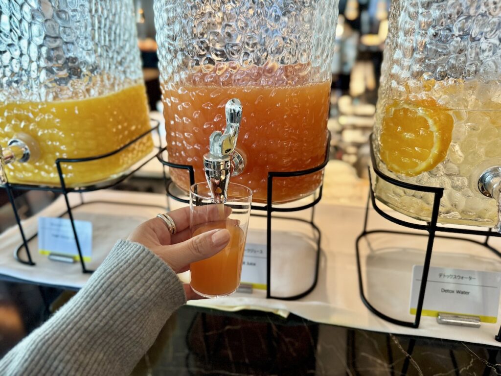 フレッシュジュースやデトックスウォーターも豊富に用意されており、どれも素材の味が濃く、朝の目覚めにぴったり。甘すぎず、自然な美味しさで、何杯でも飲みたくなります。