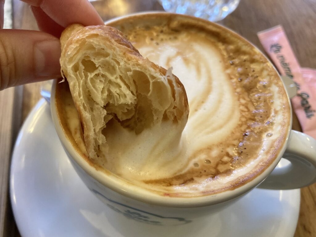 ただ、このクロワッサンにもフランス人なりの慣習があるようです。一つは、クロワッサンを毎日のようには決して食べないこと(脂肪分が多いため)。二つ目は、カプチーノにクロワッサンを「浸して」食べることです。