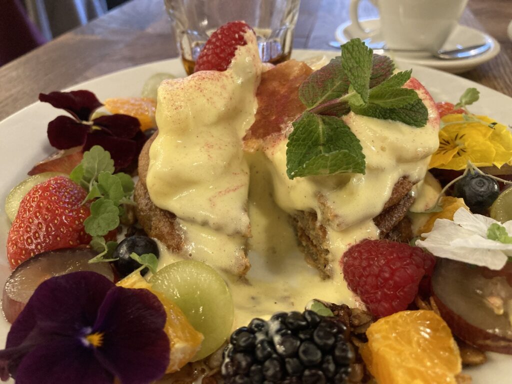 見た目が華やかなだけではありません。Saint Pearlの「Flowery Pancakes sans gluten」は、バナナとオートミールの「グルテンフリー」なパンケーキなのです。色とりどりのフルーツとバニラアイス、食用のお花が添えられいるその姿は、まさに眼福!
