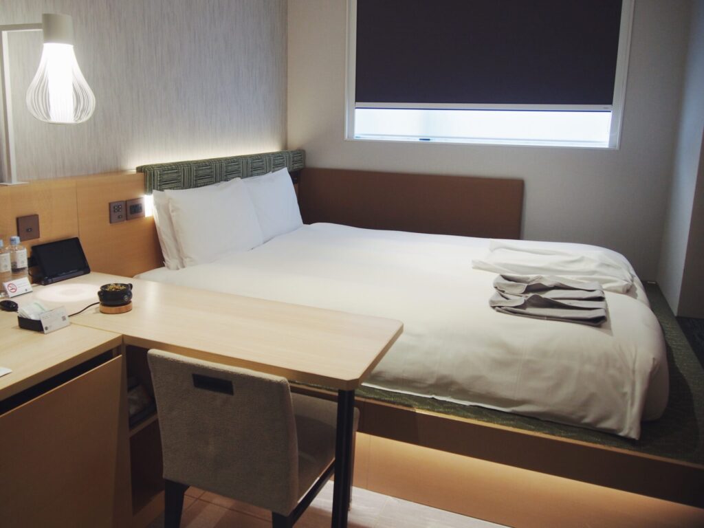 宿泊したお部屋は、スーペリアダブルB -ENGAWA-。あまり広くはないけれど、むしろそれが心地いい。大きなベッドとデスクがあり、必要なものが手の届く範囲に揃っている空間が落ち着きます。