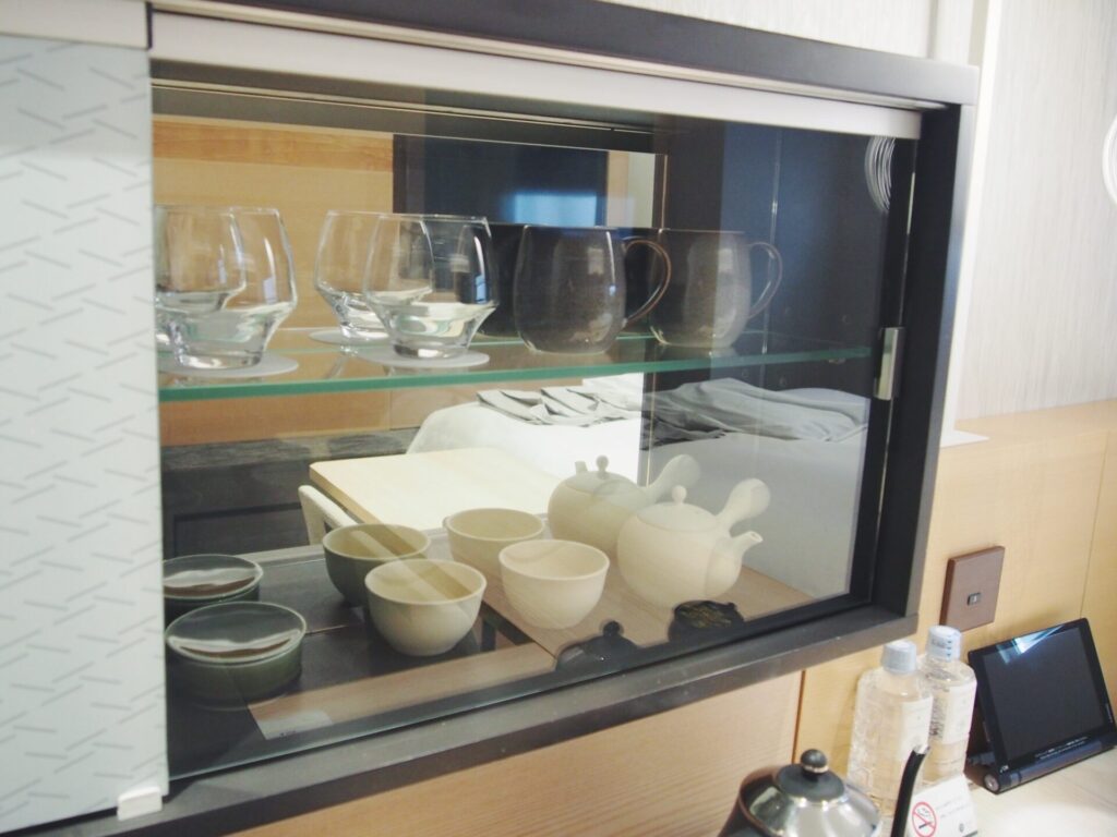 チェックインを済ませたら、お部屋に荷物を置いて、2階のティーカウンターへ。お茶とお菓子をいただきながら、このあとの過ごし方に思いを巡らせます。
