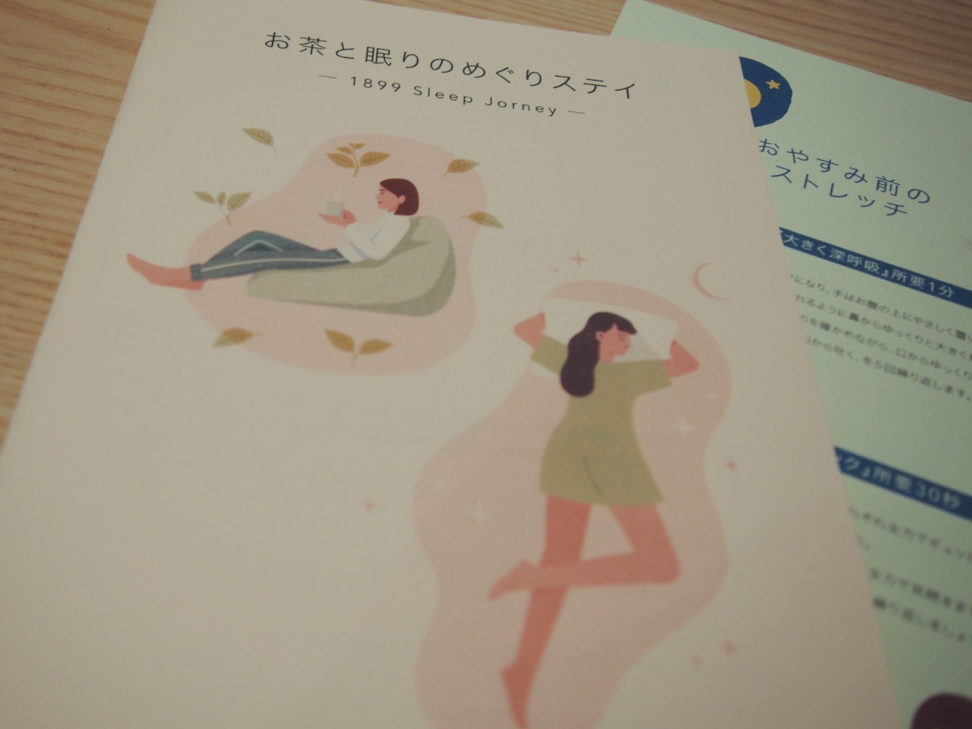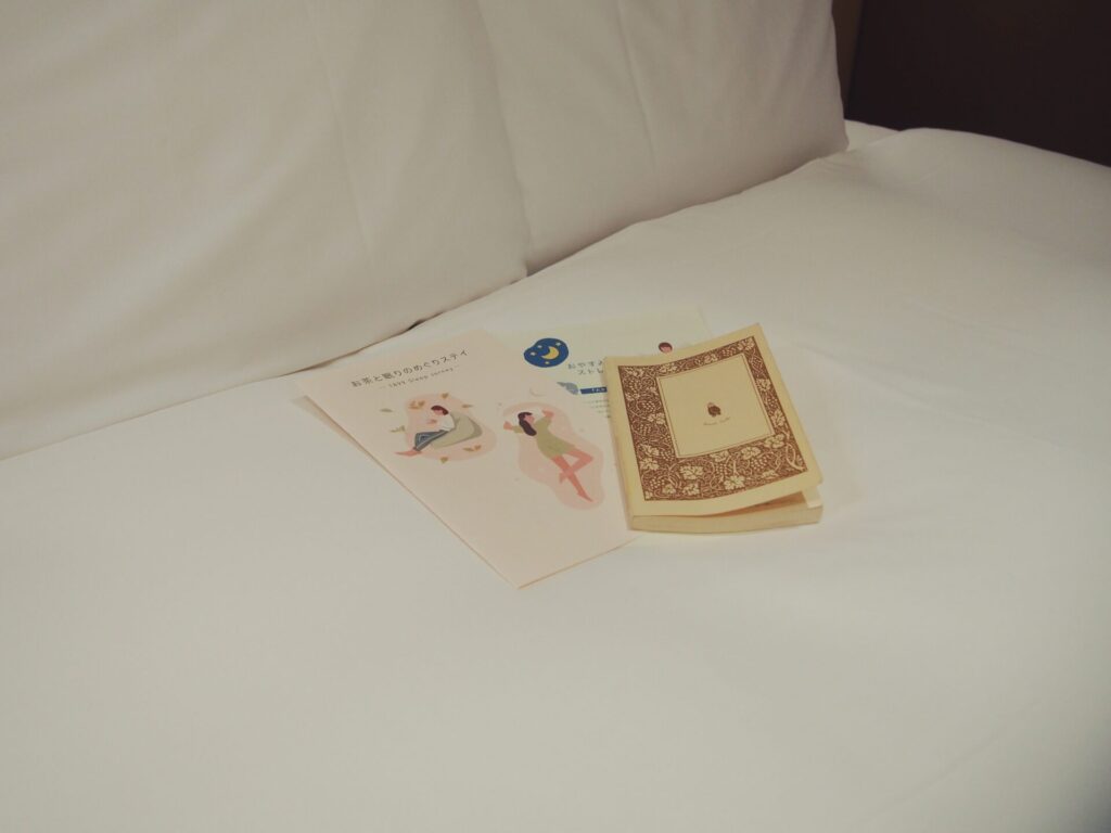 「春のセットアップ・ノート」をもう1度開いたり、読みかけの小説を開いたり、チェックインの際にいただいた「おやすみ前のストレッチ」を試したりしているうちに、ふわっと睡魔が。