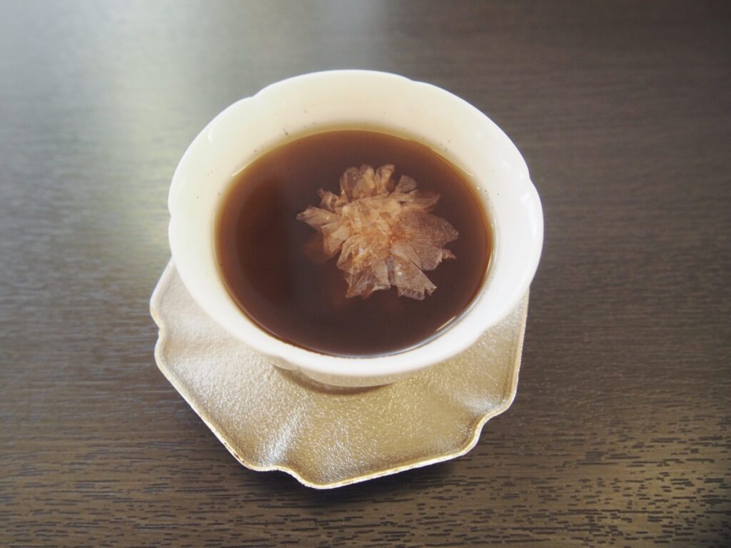 身支度を済ませてからティーカウンターへ向かい、お汁粉と桜、ほうじ茶の“お目覚めドリンク”から始めることに。
