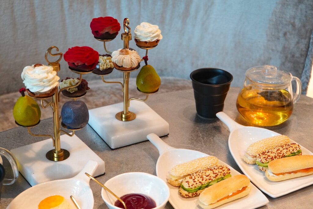 まるでアートのようなスイーツは、見ているだけでも幸せな気分に。ビジュ最強のアフタヌーンティーは乙女心をズキュンと射抜いてきます。しかも、一つひとつのケーキがどれも美味しくて小ぶりなため、様々な種類を楽しめるのも嬉しい。チョコレートやバニラなどもありますが、私は梨やパッションフルーツなどフルーツ系もさっぱりしていて好みでした。