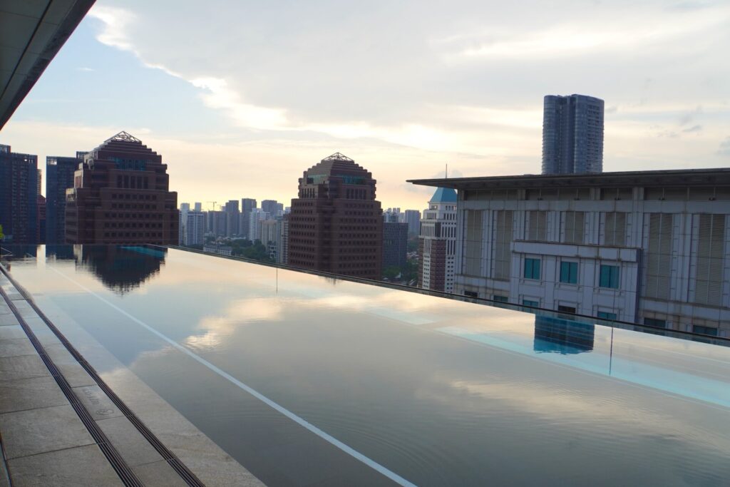 ホテルの一番上の階にはオーチャードの中心にありながら、かなり落ち着いた雰囲気のプールがあります。ゆったりした空気感と写真映えしやすいスタイリッシュなデザインのため、女子旅の観光客で写真を撮りあっている人も見かけたほど。夕方には水面に夕焼け空が映って、とっても美しかったです。