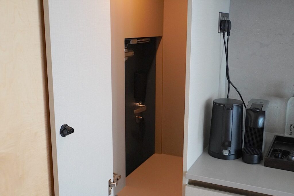 細やかなサービスとして人と会わずにルームサービスの料理や品が受け取れる小さな扉を棚の中に設置している点。これならパジャマ姿やすっぴんでも、人目を気にせず部屋でゆっくり過ごせますよね。