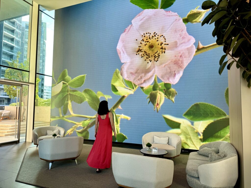 最初は、絵? と思うかもしれませんが、映像が映し出されているので常に変化していきます。色とりどりの花々が現れるので、毎回、ここにくると雰囲気が異なる空間になっているのも面白く、印象的でした。