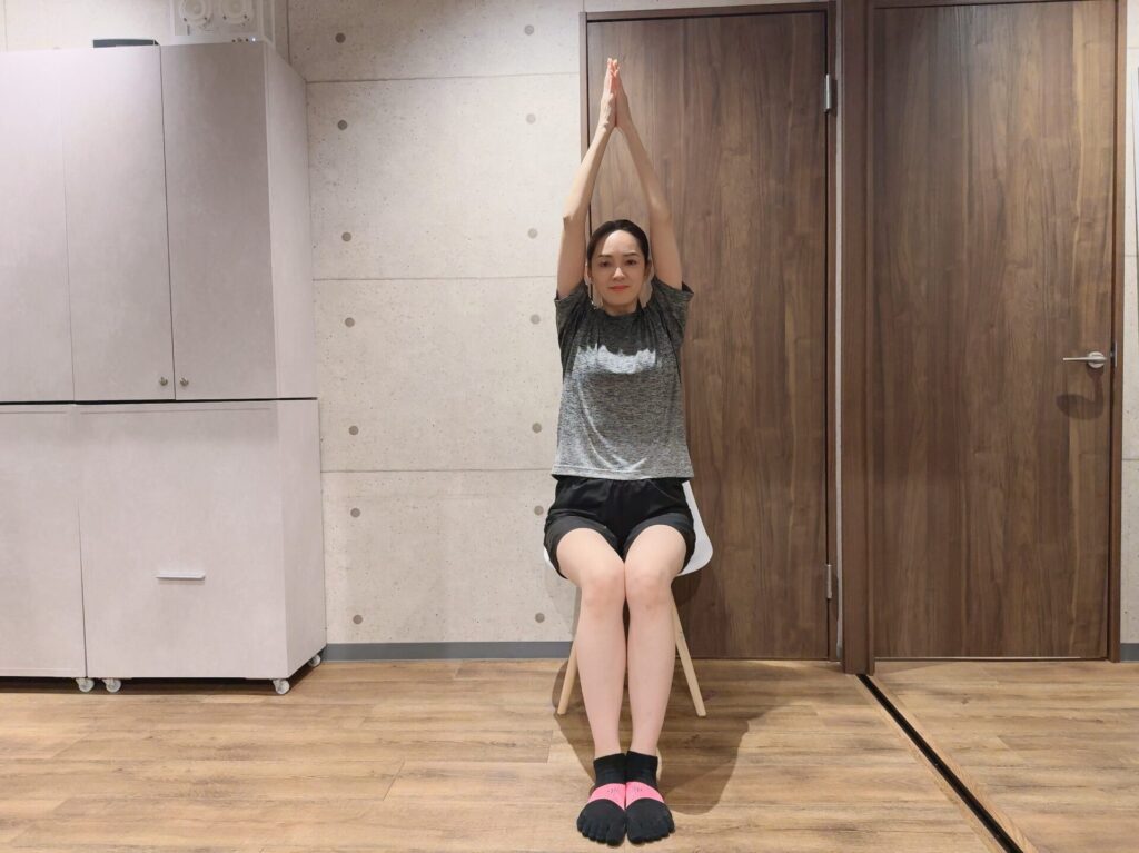 STEP1:座った状態で、両手の手のひらを合わせ上に高く上げます