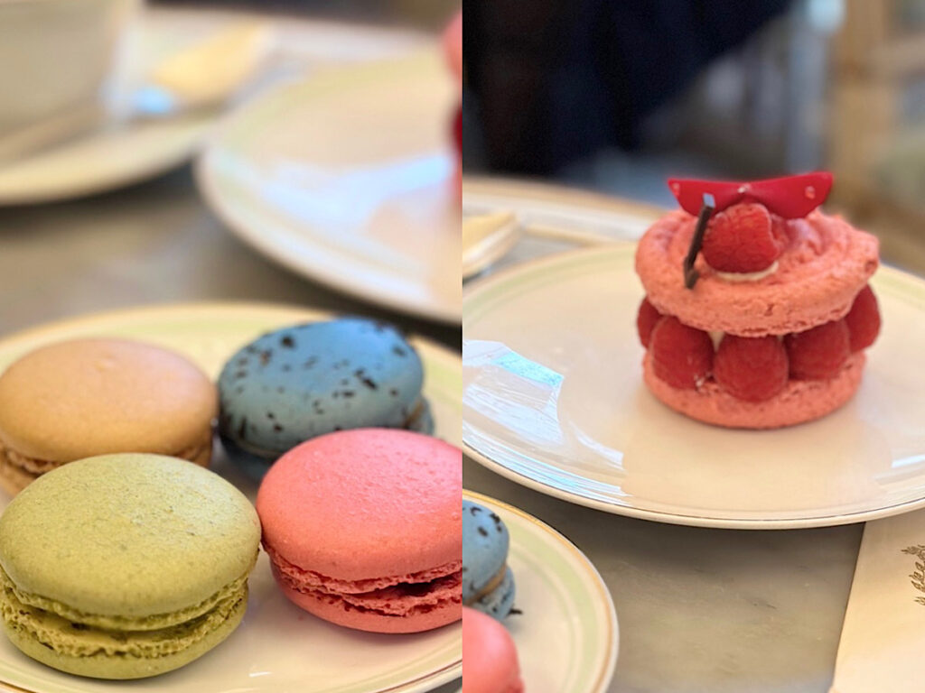 4種のマカロンと紅茶のセット、バラとフランボワーズの香りがするスイーツを堪能。口に含むとまるで香水のような華やかな香りがふわっと鼻から抜ける上品さ。本物のマカロンの味を知り感動!