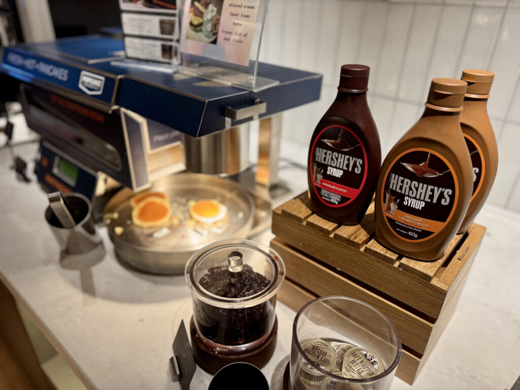 スパークリングワインとフローズンフルーツがあったので、好きなフルーツの組み合わせで飲むのもちょっとした贅沢。自動で焼き上がるパンケーキは、トッピングを自由にできてお菓子作りをした時のようなワクワク感がありました。
