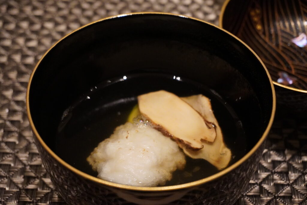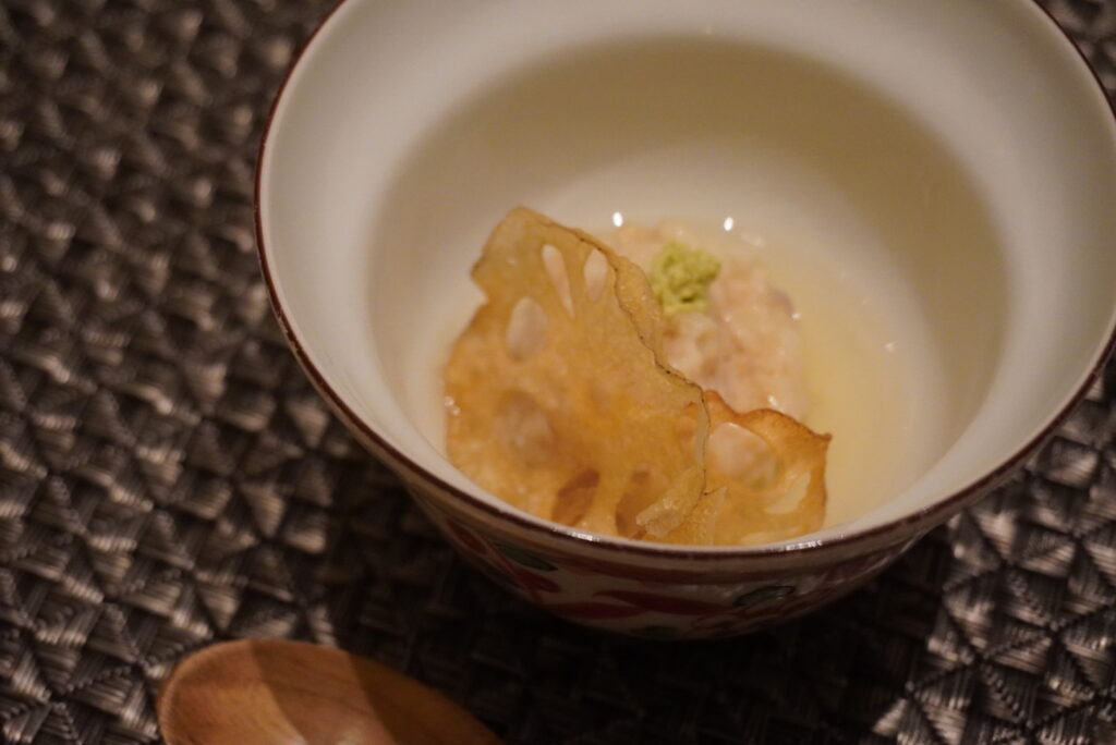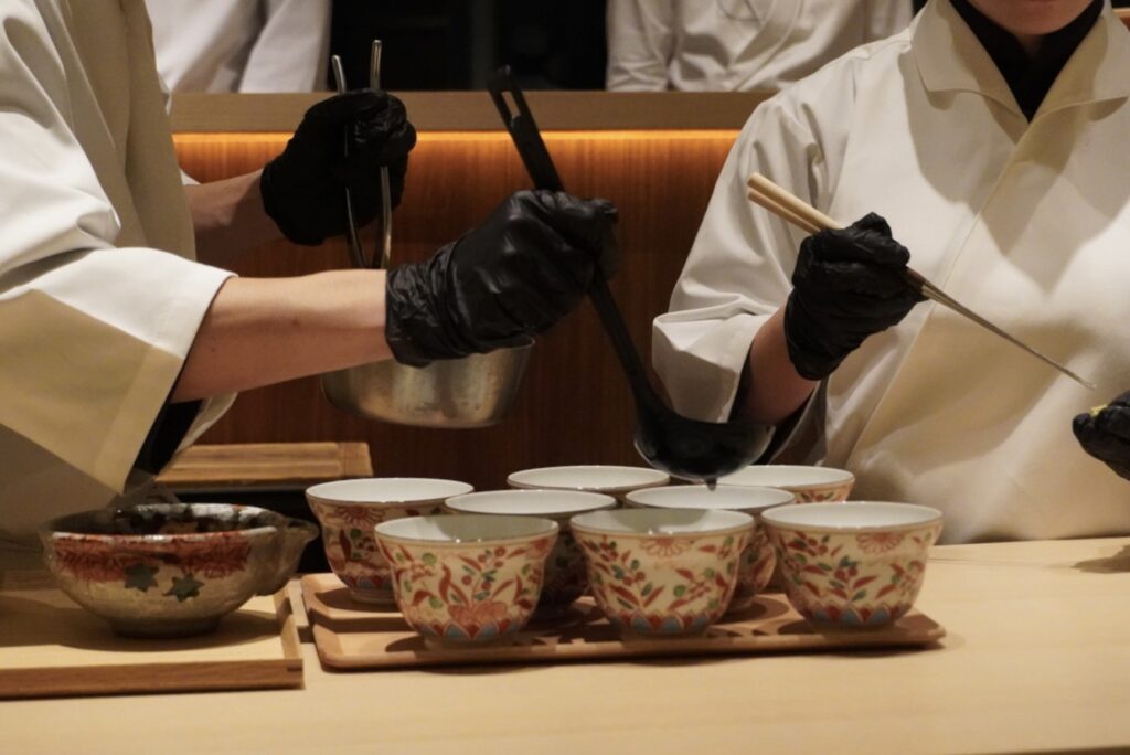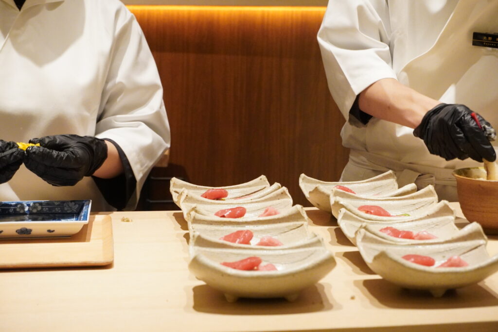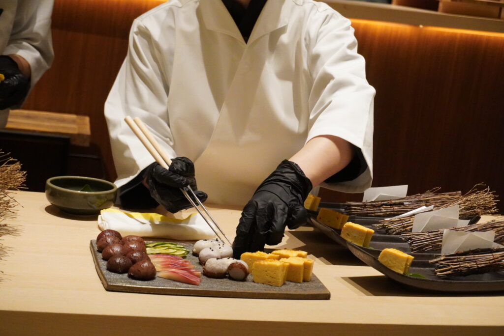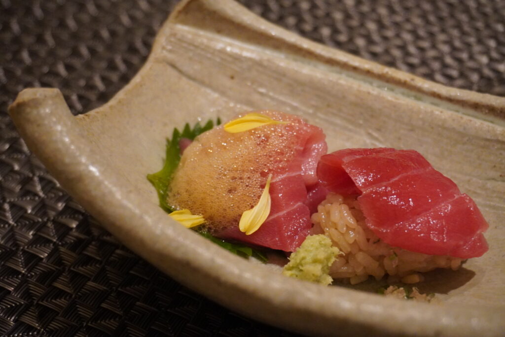 オープンに先駆けて披露されたショートコースでは、口先付、椀物、造里、焼八寸、食事といった構成で提供されました。泡醤油を添えた中トロは、口の中でとろけるような旨味が広がり、来場者の注目を集めた一品。