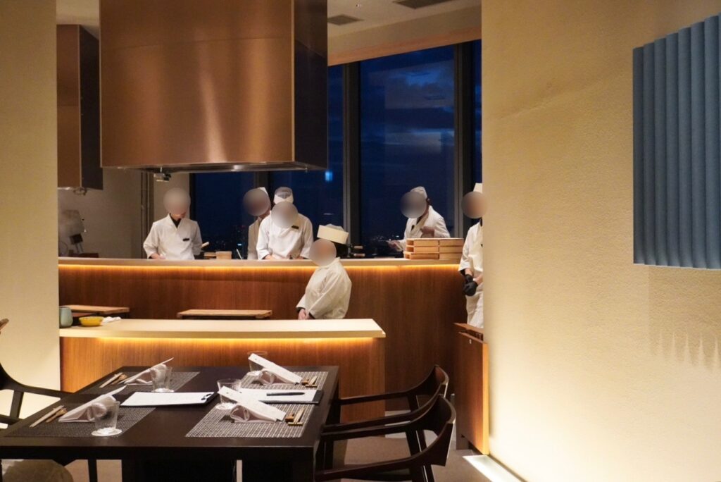 割烹 BUTAIの店内は、カウンター席と6つの個室で構成されています。29階という高層フロアからの眺望を楽しみながら、目の前で料理人が調理するライブ感を味わえるカウンター席。ここでは、包丁さばきや焼き上げる音、香りの立ち上る瞬間など、調理過程そのものが「舞台の一部」なのです。