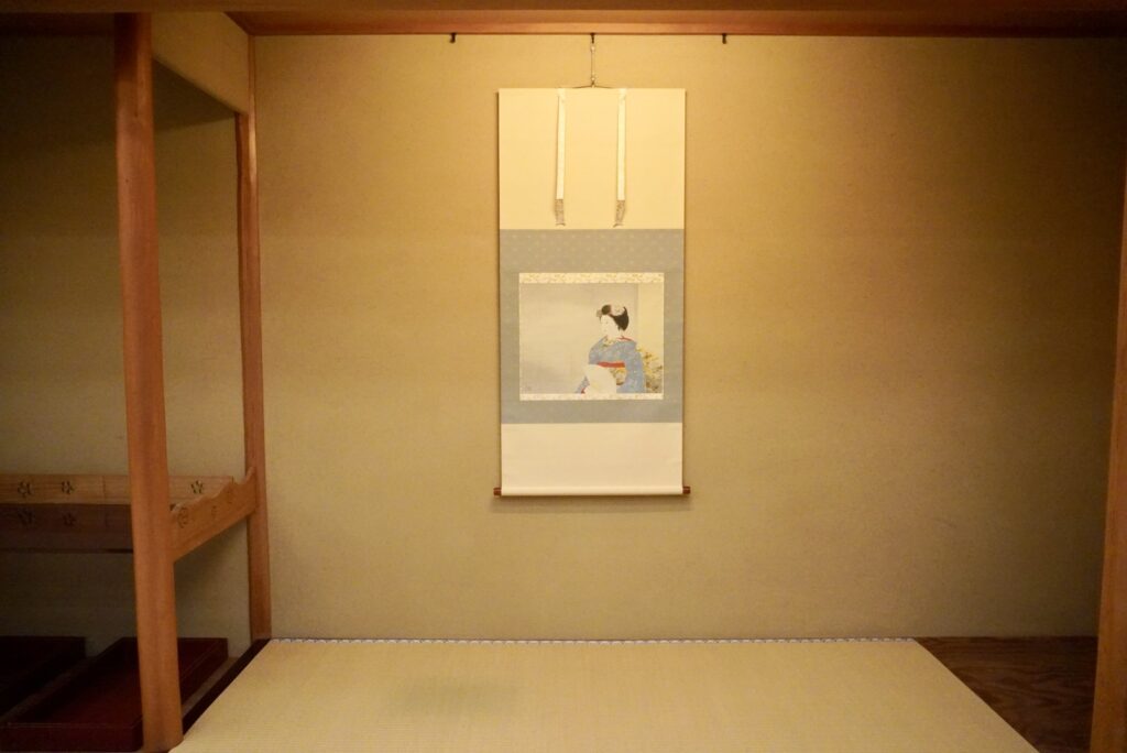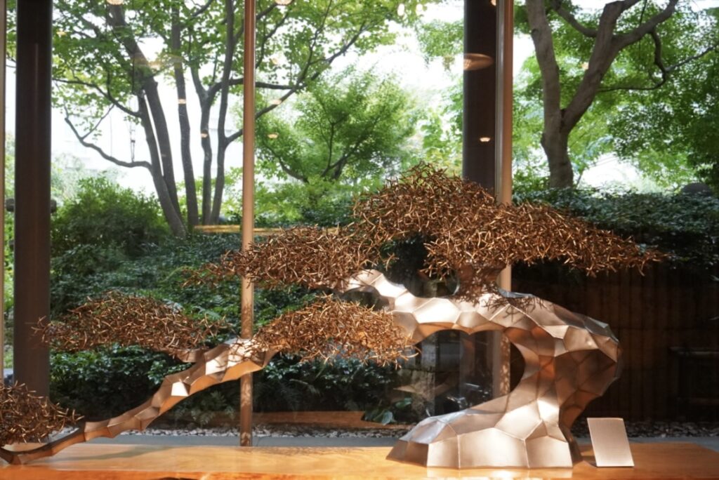 ホテル敷地内の日本庭園には、結納や茶会にも使われる数寄屋造りの茶寮があります。今回館内ツアーに運良く参加することができ、茶寮にも足を踏み入れることが叶いました。土壁や障子に込められた職人技、掛け物や花で客人を迎える心、日本建築ならではの“迎える文化”を体感し、静かな感動を覚えました。