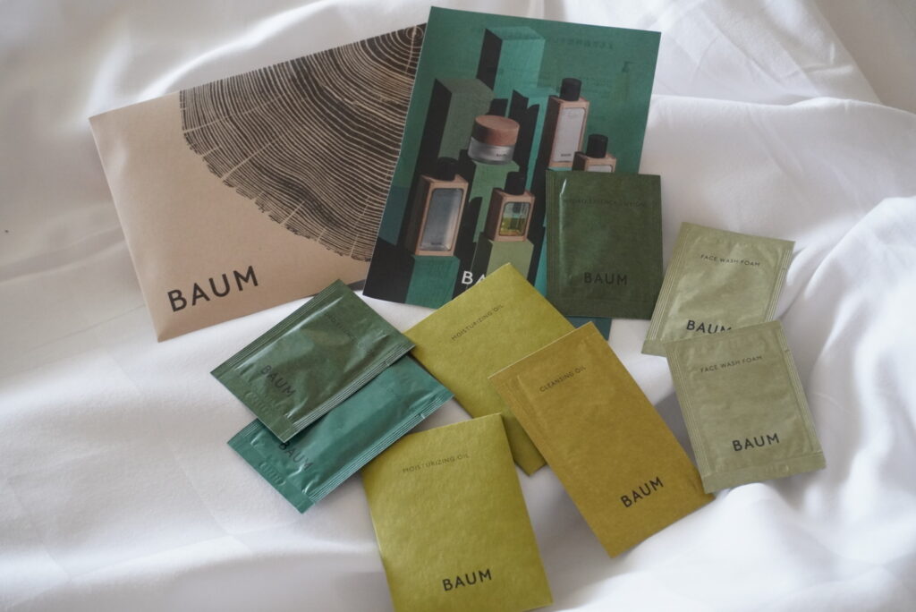 客室には、ご自宅でもリラックスできるようにと、森林浴を思わせる香りが漂うBAUMのスキンケアセットも用意されていました。夜のスキンケアに使うと、木の香りに包まれて一日の疲れがすっとほどけ、より深い眠りへと導かれるようでした。滞在の余韻をそのまま持ち帰れる、心に残るおもてなしです。