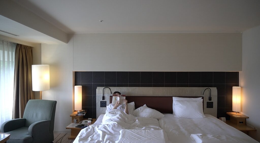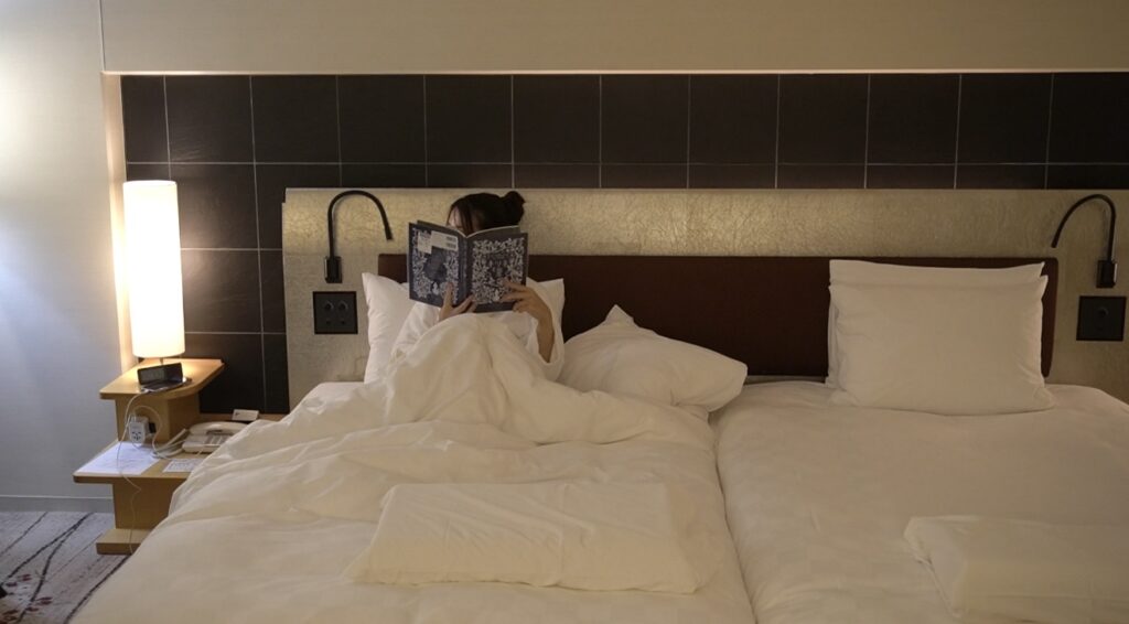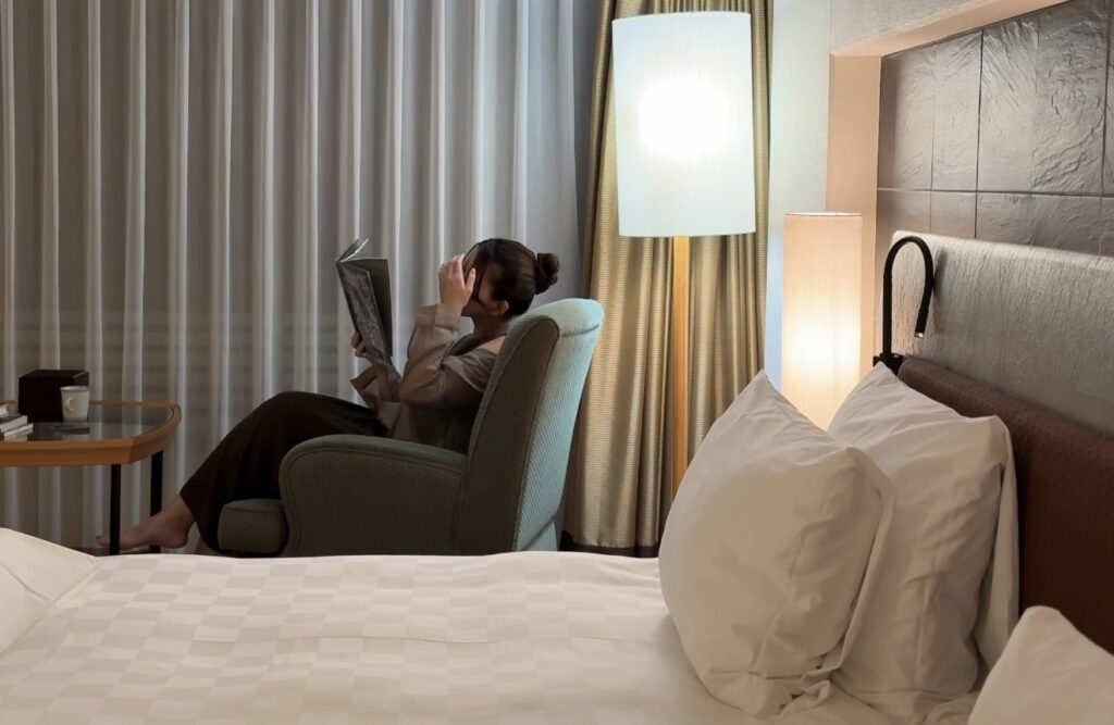 今回体験したのは「読書×快眠」をテーマにしたクラブフロア限定プラン。眠りを整えるための環境が用意されています。ベッドは身体をやさしく包み込むような寝心地で、照明は柔らかな色合い。静かな空気の中で本を開き、気持ちが落ち着いたところで自然に眠りへ。その流れが驚くほど心地よく生まれていきました。