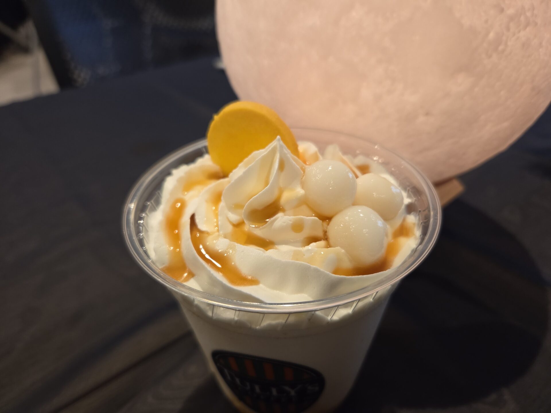 上にのっている白玉と、お月さまをイメージしたまんまるの黄色のクッキーが秋のムードを引き立てます。