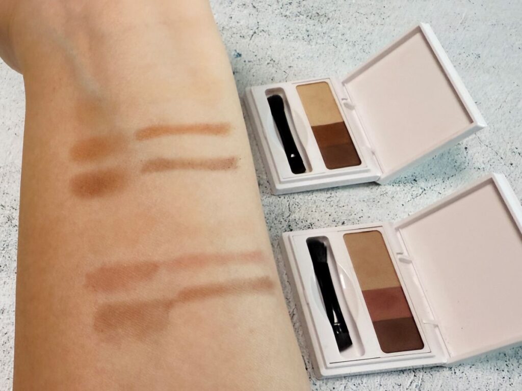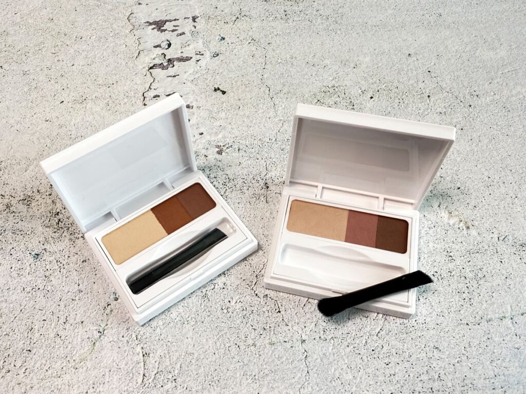 眉に溶け込むように自然になじむパウダーは、【01 ナチュラルブラウン(左)】と【02 ピンクブラウン(右)】の2色展開。一番淡い色の割合が多いのがこの商品のポイント。肌色をわからないくらい自然にトーンダウンするので、立体眉・骨格メイクが失敗せずにできちゃいます。