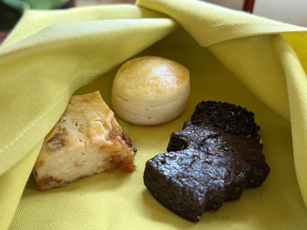 コウモリ型のスコーンは、黒胡麻があしらわれ、香ばしい味わい。ナプキンに包まれた状態で提供され、ほんのり温かいままいただけるのも嬉しいポイントです。