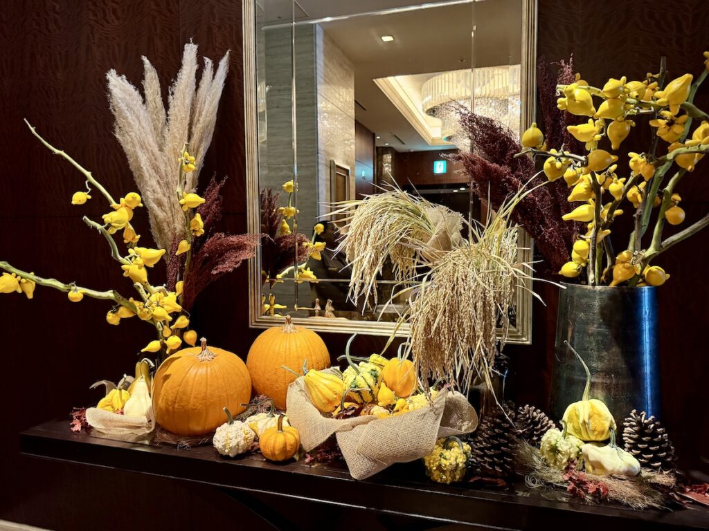 この時期は秋らしい装飾がほどこされ、オレンジやゴールドを基調にしたデコレーションが華やか。
