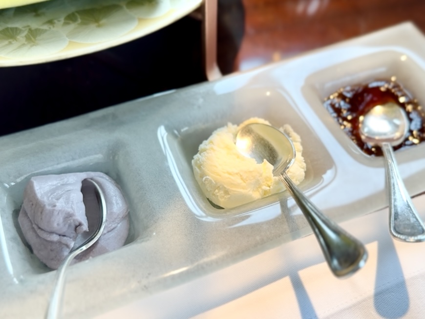 スコーン用のジャムは、紫芋、黒テットクリーム、いちじくの3種。どれも秋らしい素材で、スコーンとの相性も抜群でした。