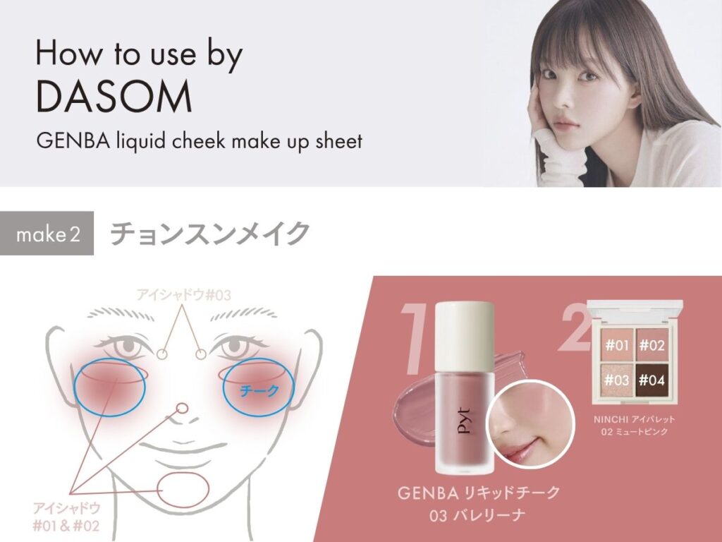 アイシャドウはピンク味のパウダー(#01)、中間色(#02)を混ぜてアイホールに広げていきます。パール入りのパウダー(#03)を下まぶたに、淡いピンクカラー(#01)を鼻先、鼻筋、あご先に塗り、立体感を出します。チークはイラストのピンクの丸印の箇所にリキッドチーク 03 バレリーナをチップで3点置きし、指またはパフでタップしながら広げていきます。リップはピンクカラーで仕上げると、チョンスンメイクの完成です。