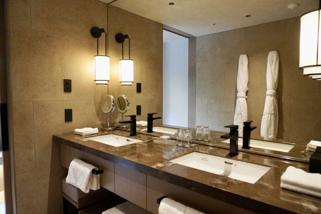 ダブル洗面台を備えたパウダールームは、女子旅やカップルでの滞在にも最適。洗い場付きの大理石バスルームでは、深めのバスタブに身を沈めながら、旅の疲れをゆっくりと解き放てます。湯上がりの肌にやわらかく触れるバスローブの質感さえ、五つ星の証のよう。
