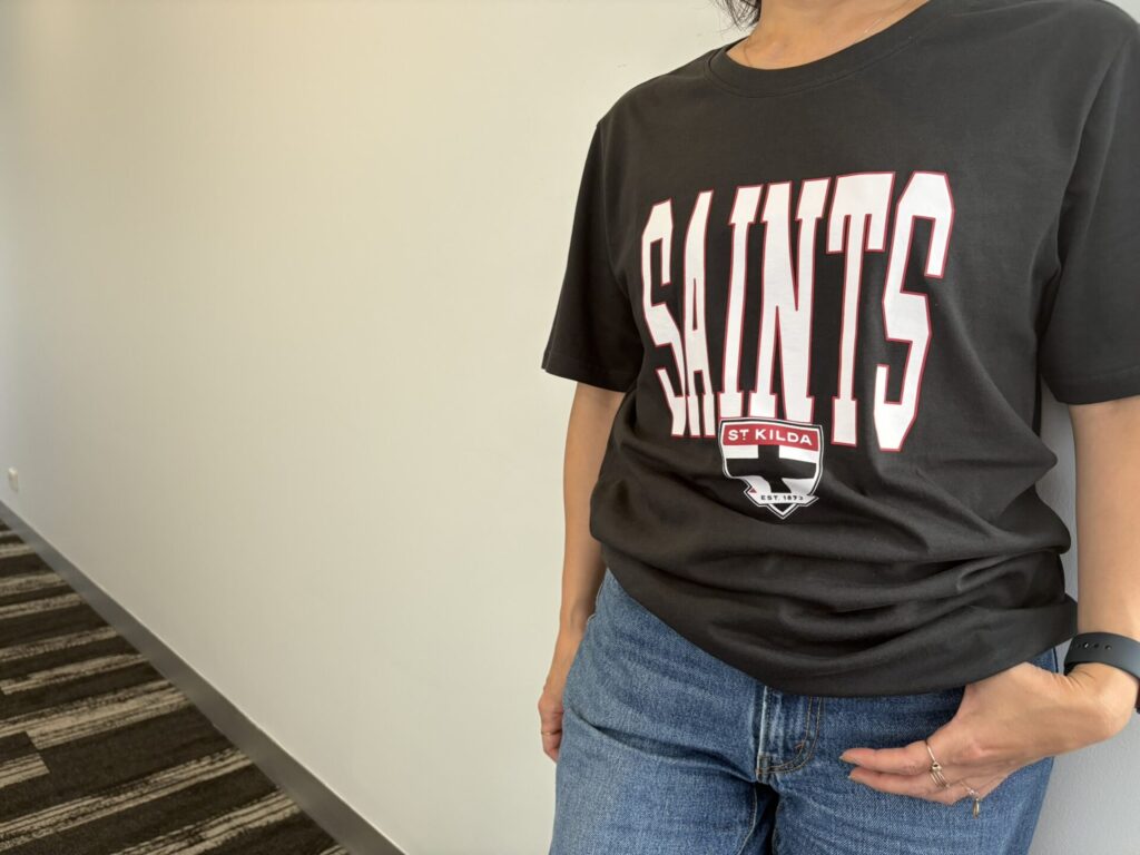 こちらもメルボルンのクラブで、本拠地は海沿いの街セント・キルダ。チームカラーは赤・白・黒で、十字架モチーフのロゴが特徴です。ファン思いのクラブとして知られ、地元の人たちから愛されています。このTシャツはスポーツ売り場でセール中(定価12ドル)になっていたところを発見!