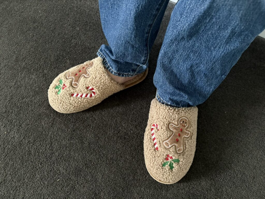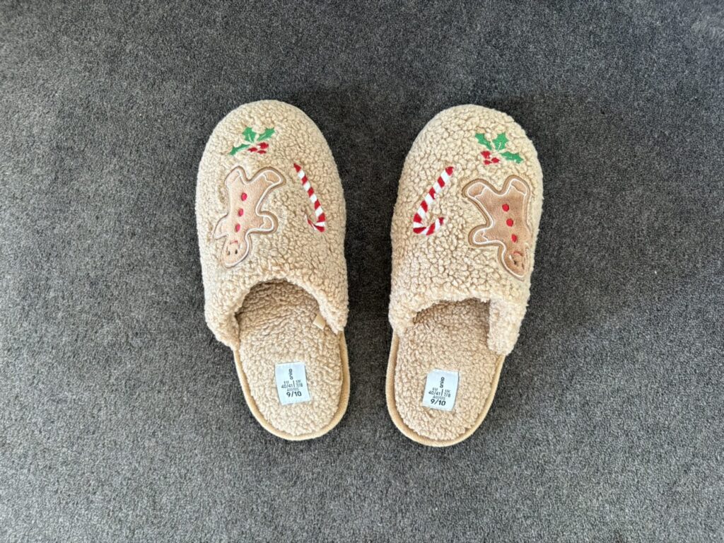 Kmartはサンダルやスリッパなどの履き物も豊富。季節ごとのアイテムも登場し、クリスマス向けのジンジャーブレッド柄スリッパを見つけました! 足を入れた瞬間に思わず笑顔になるふかふかの履き心地で、見るたびに気分が上がります♡