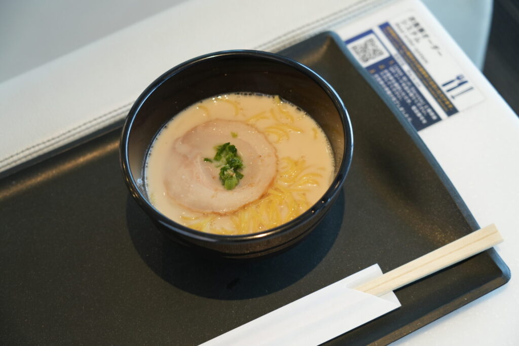 旅の始まりにはまずシャンパンで乾杯。続いて、ヌードルバーでANAラウンジ名物のとんこつラーメンを。香りの立つスープに細麺が絡み、思わずにんまり。これから始まるパース便への気持ちを一気に高めてくれます。