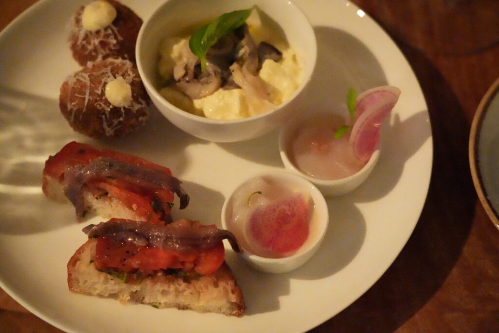 まず運ばれてきたのは、ツナのブルスケッタ。ケッパーとシャロット、レモンの酸味が心地よく、食欲をやさしく目覚めさせてくれる一皿。