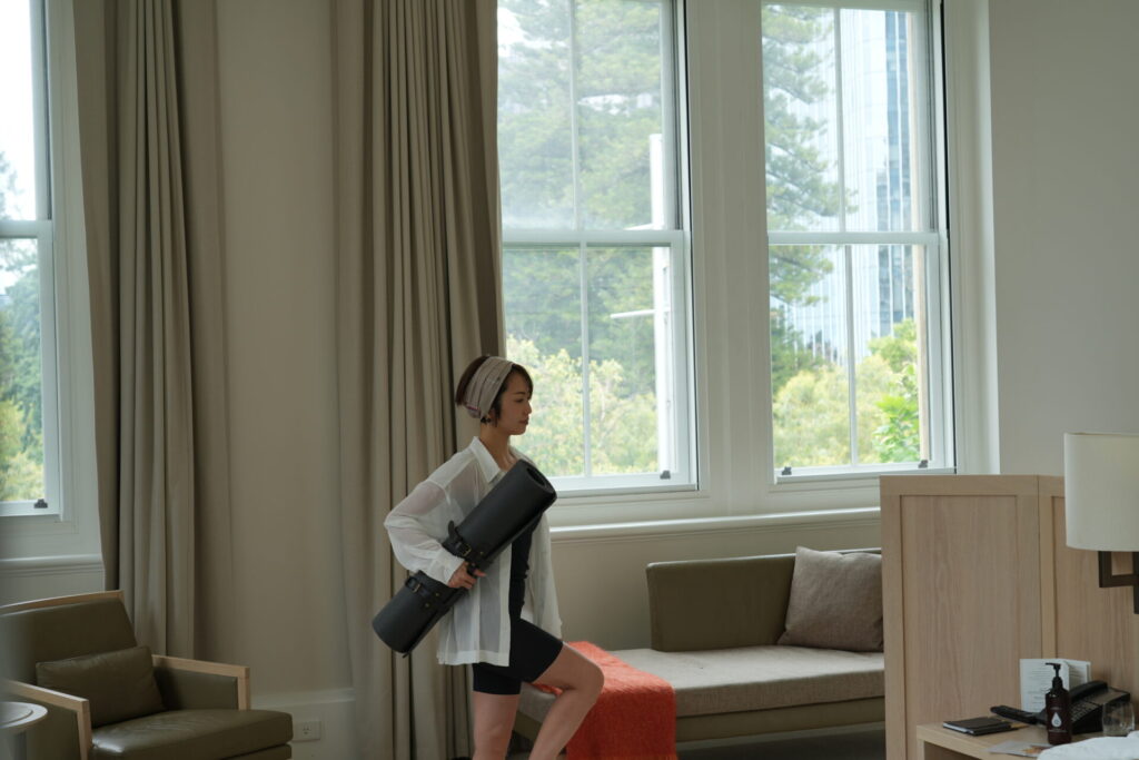 ホテル前の芝生「Cathedral Lawn」で定期的に朝YOGAクラスが開催されています。今回は残念ながら雨天で中止になってしまったので、代わりに客室に備わっていたヨガマットを使って、セルフヨガ&ストレッチを。旅先で乱れがちな呼吸を整え、心身をニュートラルに戻す時間に。