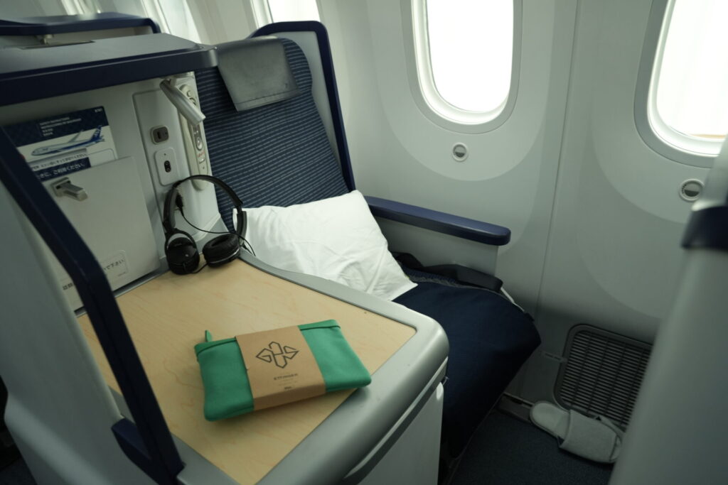 ビジネスクラスはフルフラットシートで、マットレスやパジャマのレンタルも可能。深い眠りを確保できるのが最大の魅力。到着後の疲労感が驚くほど軽減されます。